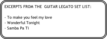 Copyright Guitar Legato 2011 © All rights reserved. Guitar Legato smooth, live guitar melodies telephone:  0771 421 8825     email: info@guitarlegato.co.uk Home Bookings About Terms and Conditions Playlist Playlist